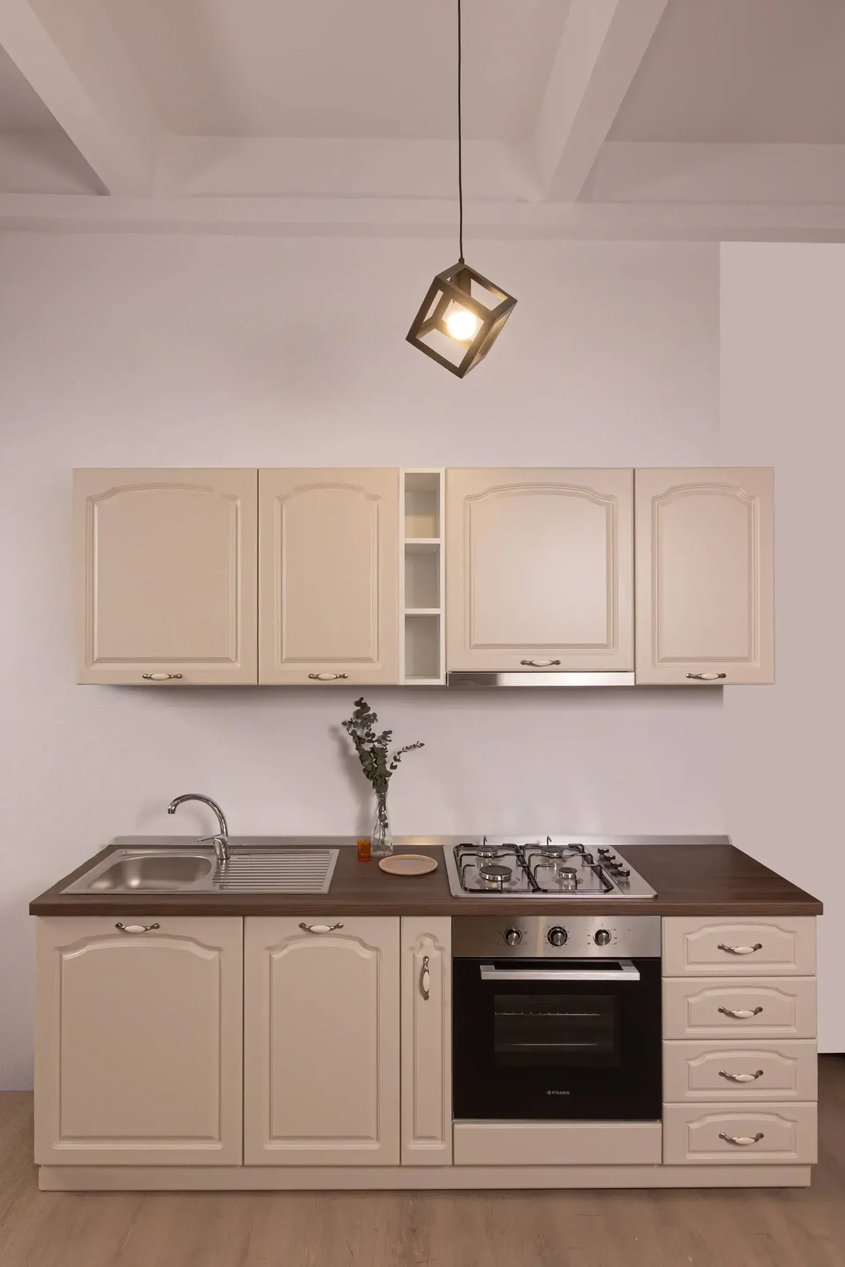Redescoperă farmecul stilului clasic în nuanțe calde. Setul de bucătărie Compact 4 aduce atmosfera romantică a regiunii Provence direct în casa ta. Cu fronturi finisate într-un superb Crem Mat, decorate cu frezări curbate („Arcadă”) și mânere ceramice antichizate, această bucătărie emană eleganță și rafinament. Dincolo de estetica deosebită, te bucuri de soliditatea modernă garantată de Insidecor: carcase din PAL Egger de 18mm, feronerie Hafele/Blum cu închidere amortizată (Soft Close) și organizare optimizată. O investiție în confort, stil și durabilitate, fabricată cu mândrie în România.