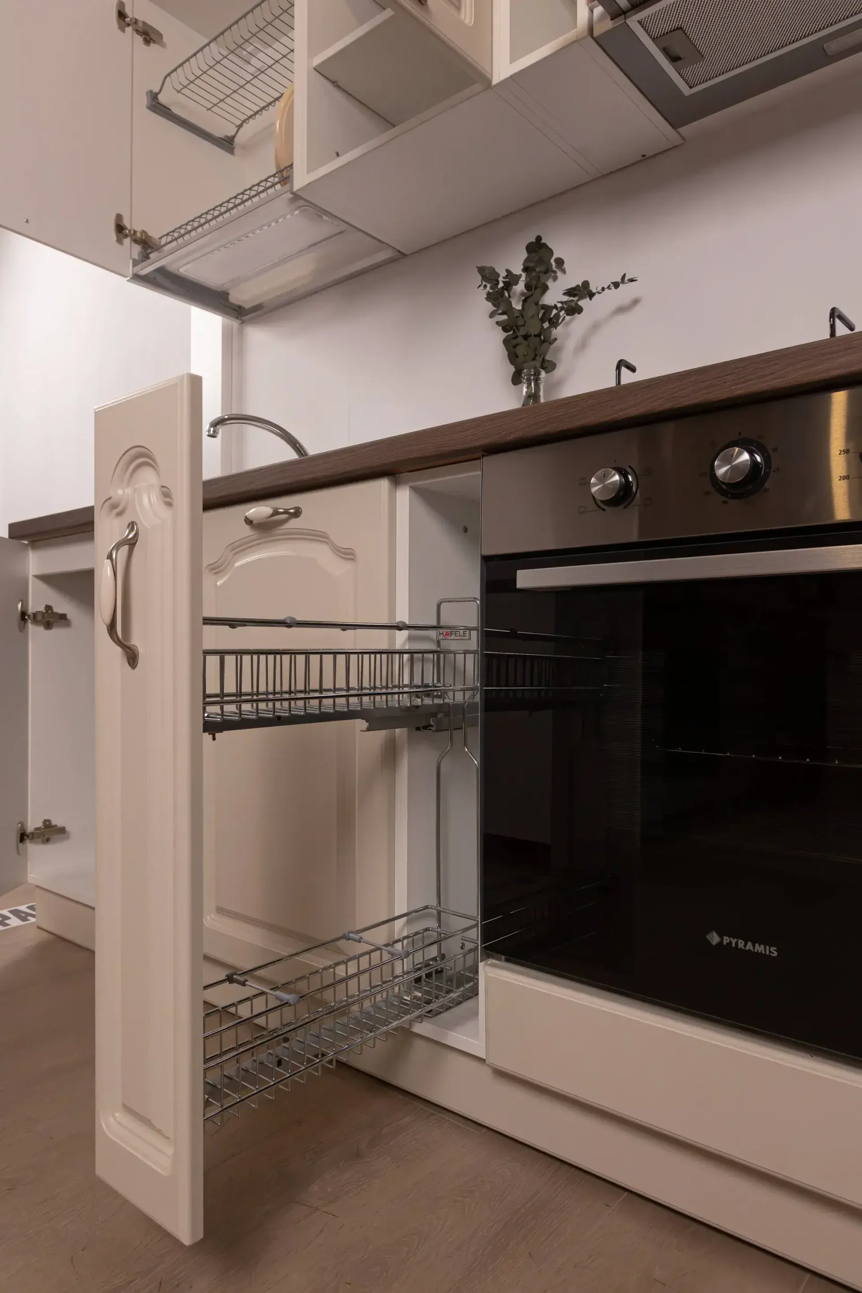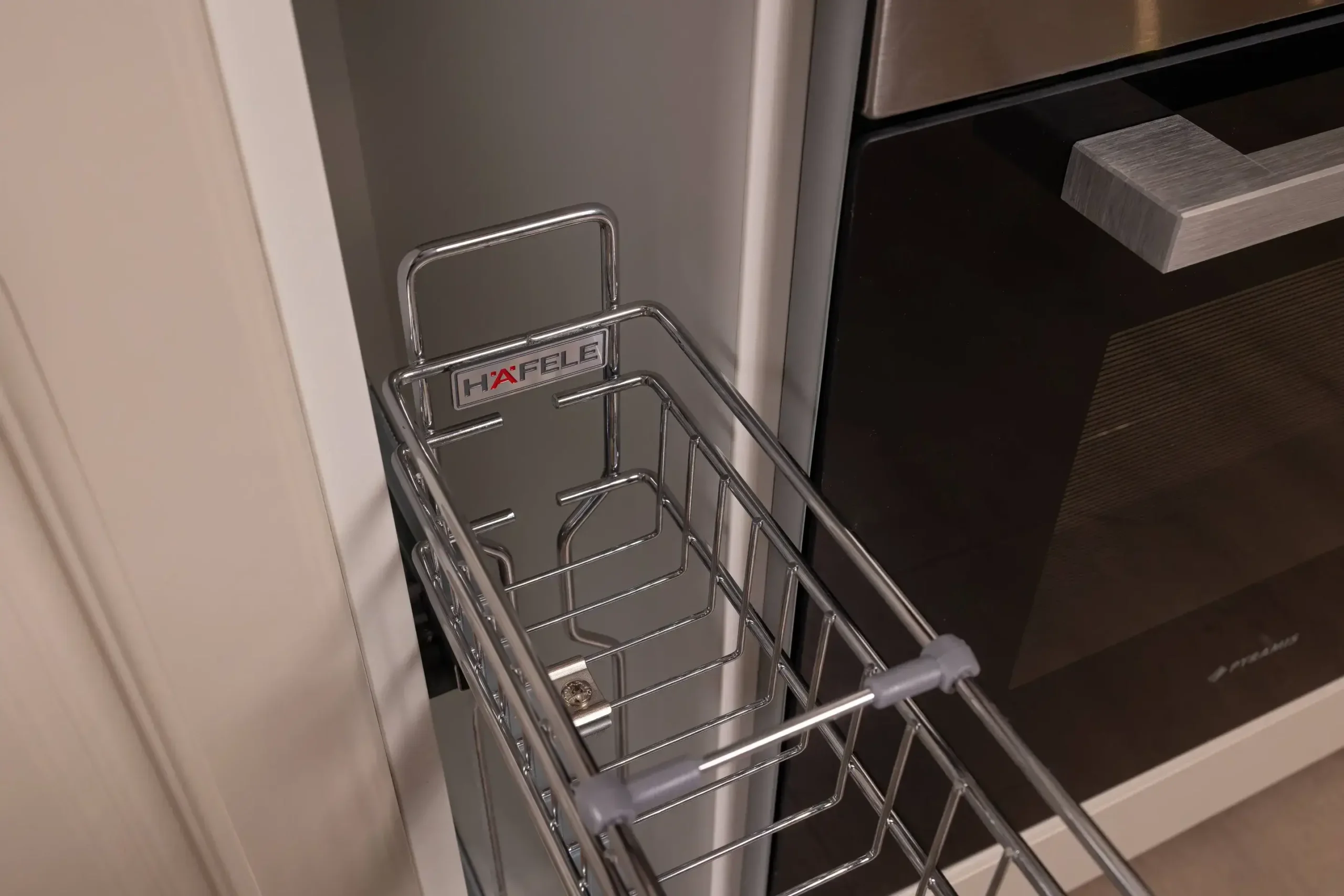 - Coș Joly Extractibil: Corpul îngust de lângă cuptor ascunde un sistem metalic cromat pe glisiere, ideal pentru a ține la îndemână sticlele de ulei, oțet și borcanele cu condimente.