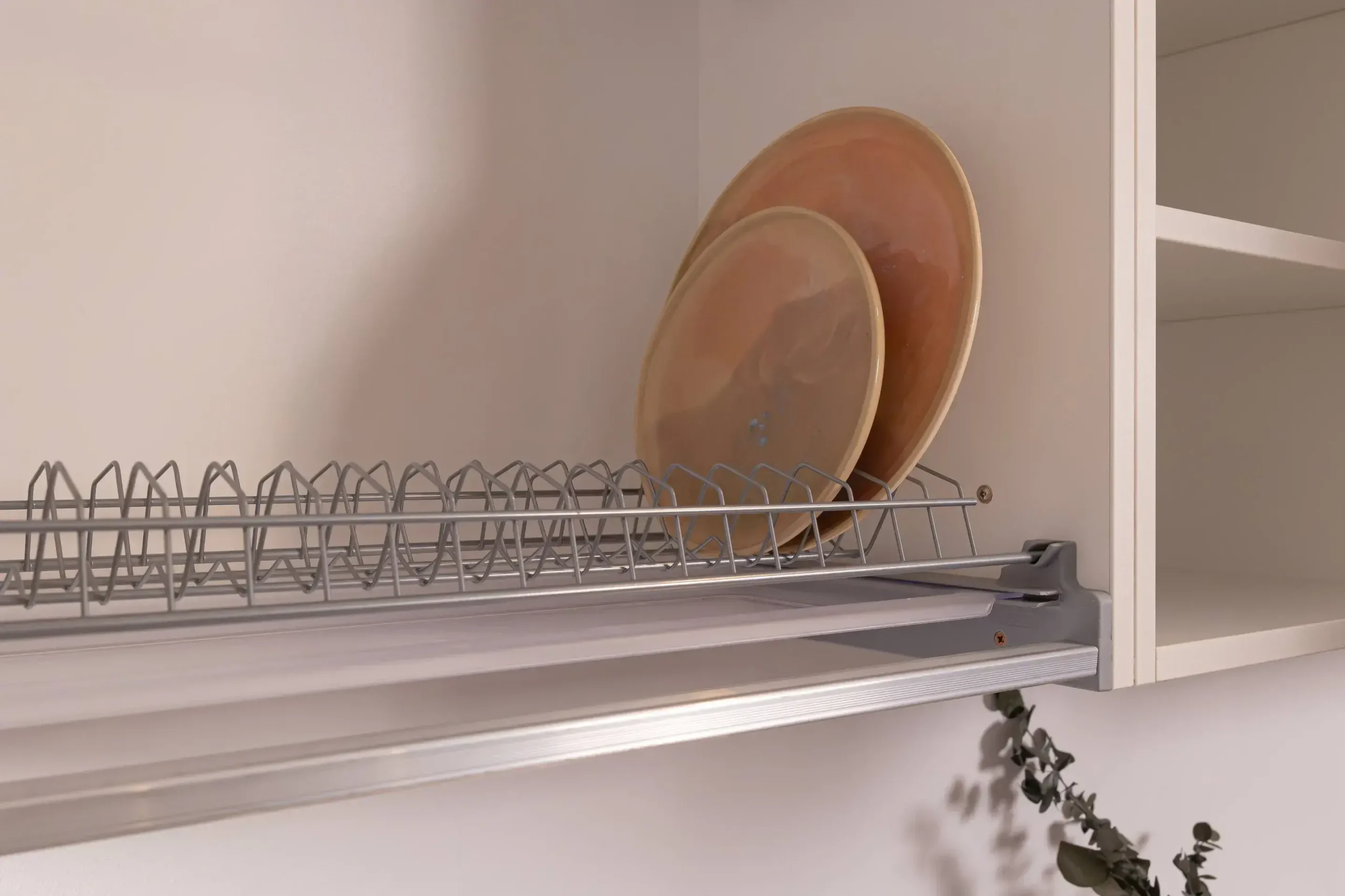 - Scurgător de Vase Integrat: Corpul suspendat deasupra chiuvetei include un scurgător de vase pe două nivele, cu tăviță de colectare, păstrând blatul liber și ordonat.