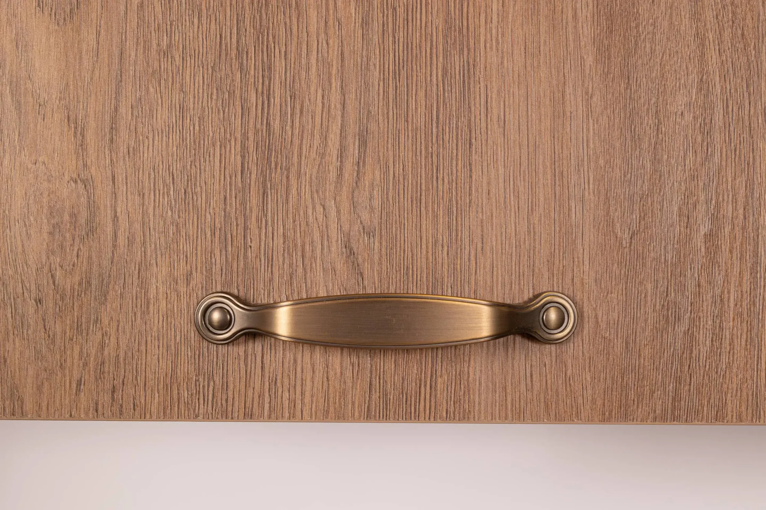 Contrastul este cheia acestui design: căldura fronturilor este echilibrată de albul imaculat al carcasei și al blatului modern, subțire. „Bijuteriile” ansamblului sunt mânerele metalice curbate, cu finisaj bronz antichizat, care adaugă o notă de rafinament și nostalgie.