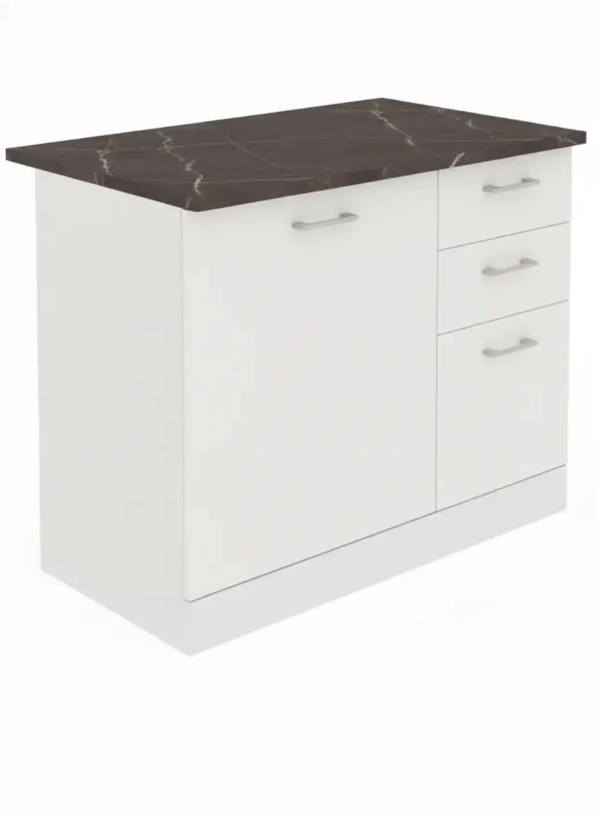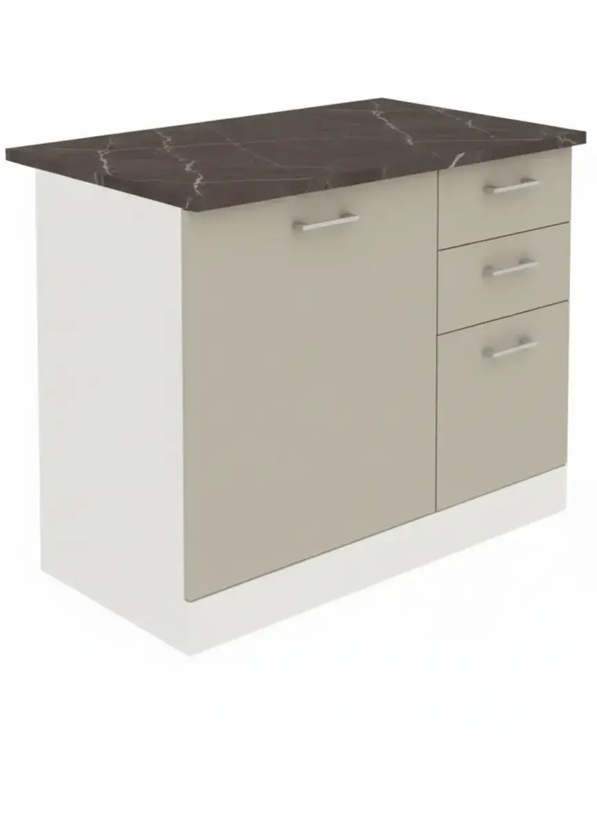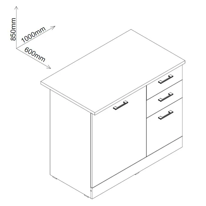 Dimensiunile corpului modular inferior sunt 100 cm latime, 47 cm adancime si 82 cm inaltime, iar blatul inclus are 100 cm latime, 60 cm adancime si 2.5 cm grosime. Astfel, dimensiunile totale ale acestui corp inferior sunt 100 cm latime, 60 cm adancime si 85 cm inaltime (cu blatul si picioarele montate).