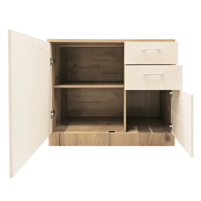Compartimentarea interioara este prevazuta cu doua sertare, o usa care acopera un raft si o usa care acopera doua rafturi. Picioarele au inaltimea de 6 mm, iar manerele sunt realizate din material plastic.