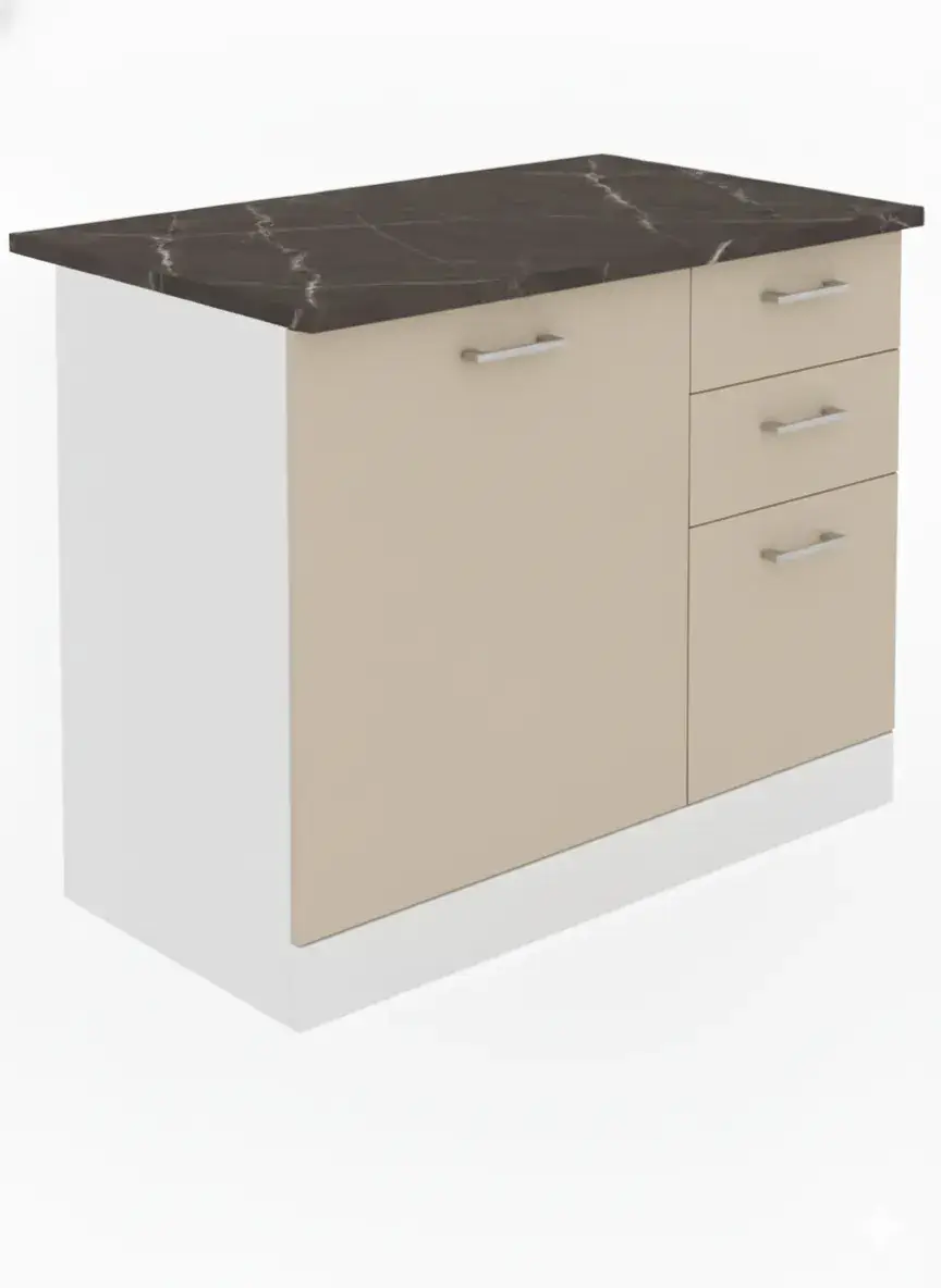 Corpul inferior pentru bucatarie Smart 1000 este realizat dintr-o carcasa cu finisaj stejar A458, care imita aspectul lemnului si fronturi cu finisaj crem mat, care confera eleganta si rafinament. Imbinarea celor doua nuante calde creeaza un ambient modern si primitor.
