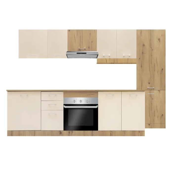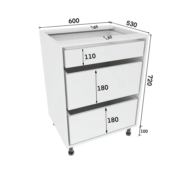 Finisajul alb de la nivelul carcasei se imbina armonios cu finisajul stejar sonoma de la nivelul frontului, rezultand o combinatie atragatoare si un design minimalist. Piesa modulara are 60 cm latime, 53 cm adancime si 82 cm inaltime, iar interiorul acesteia dispune de trei sertare incapatoare. Astfel, cu trei sertare practice corpul de bucatarie ofera spatiul necesar pentru organizarea eficienta a obiectelor si ustensilelor. Canturile sunt prevazute cu poliuretan, un adeziv care asigura o buna rezistenta la aburi si apa.